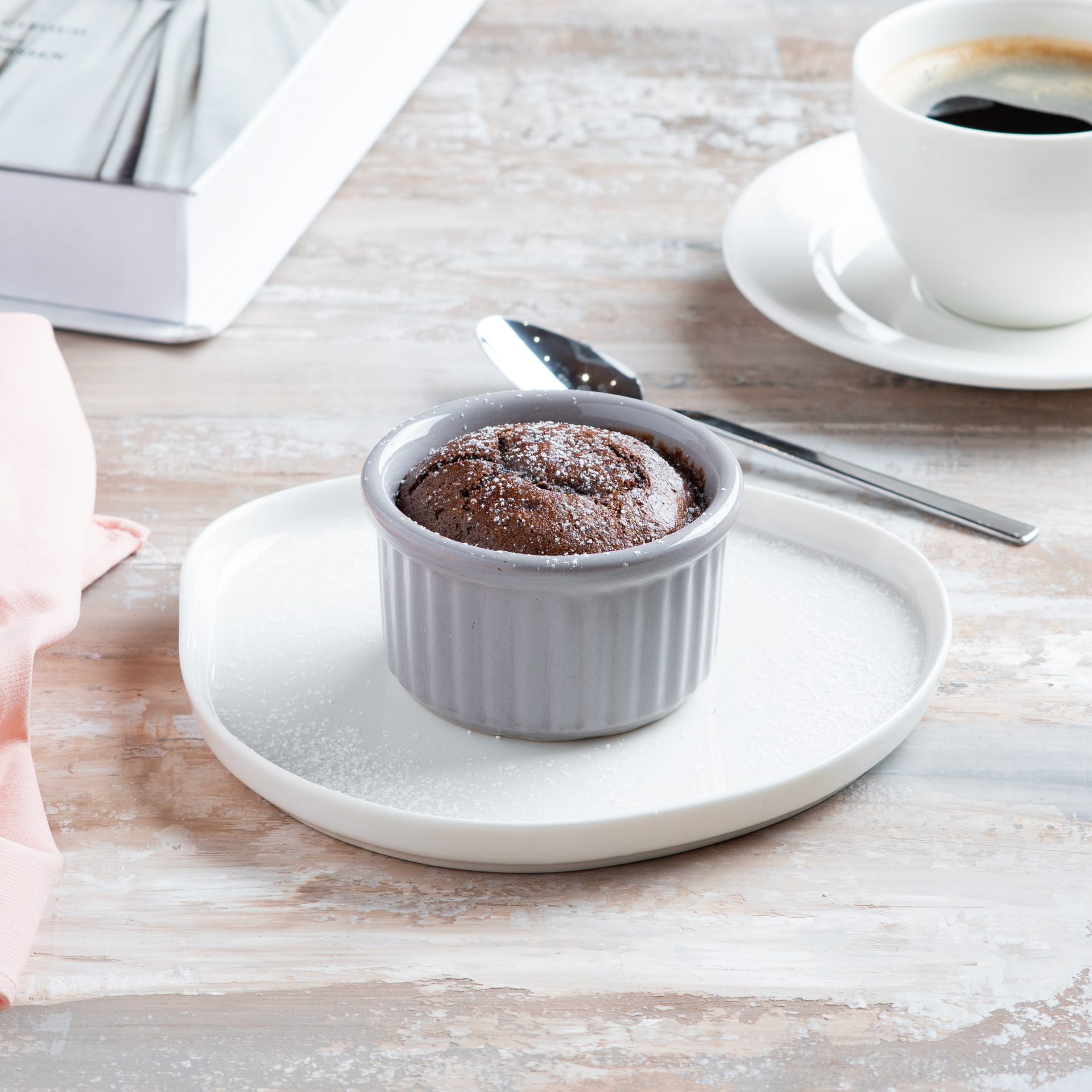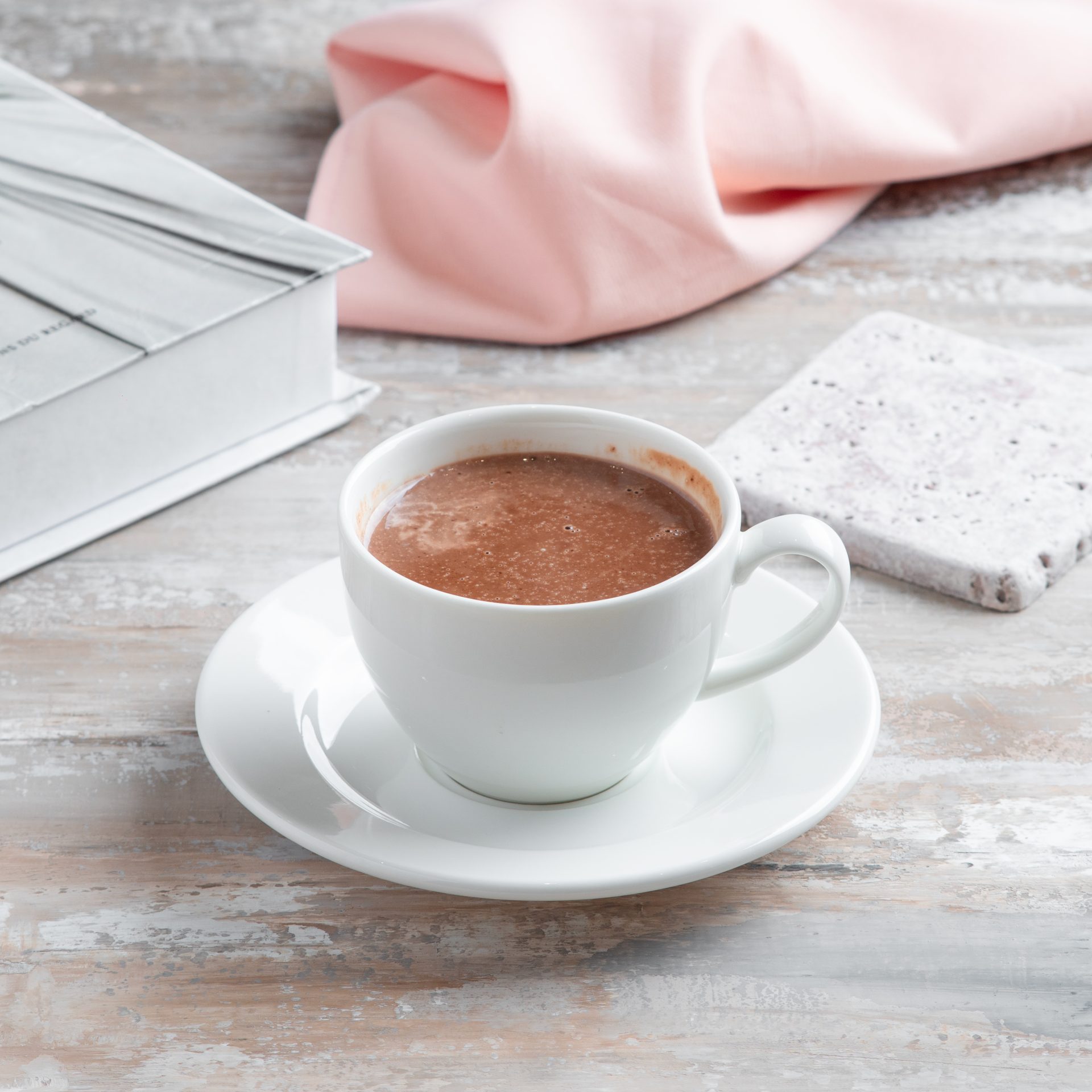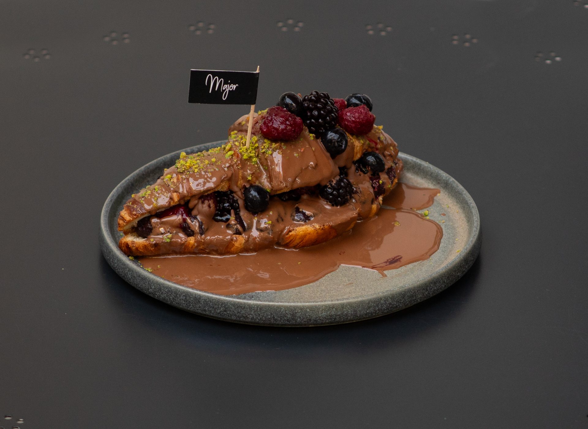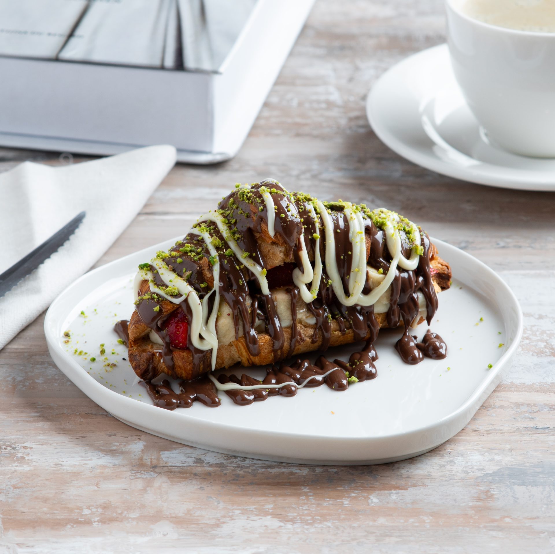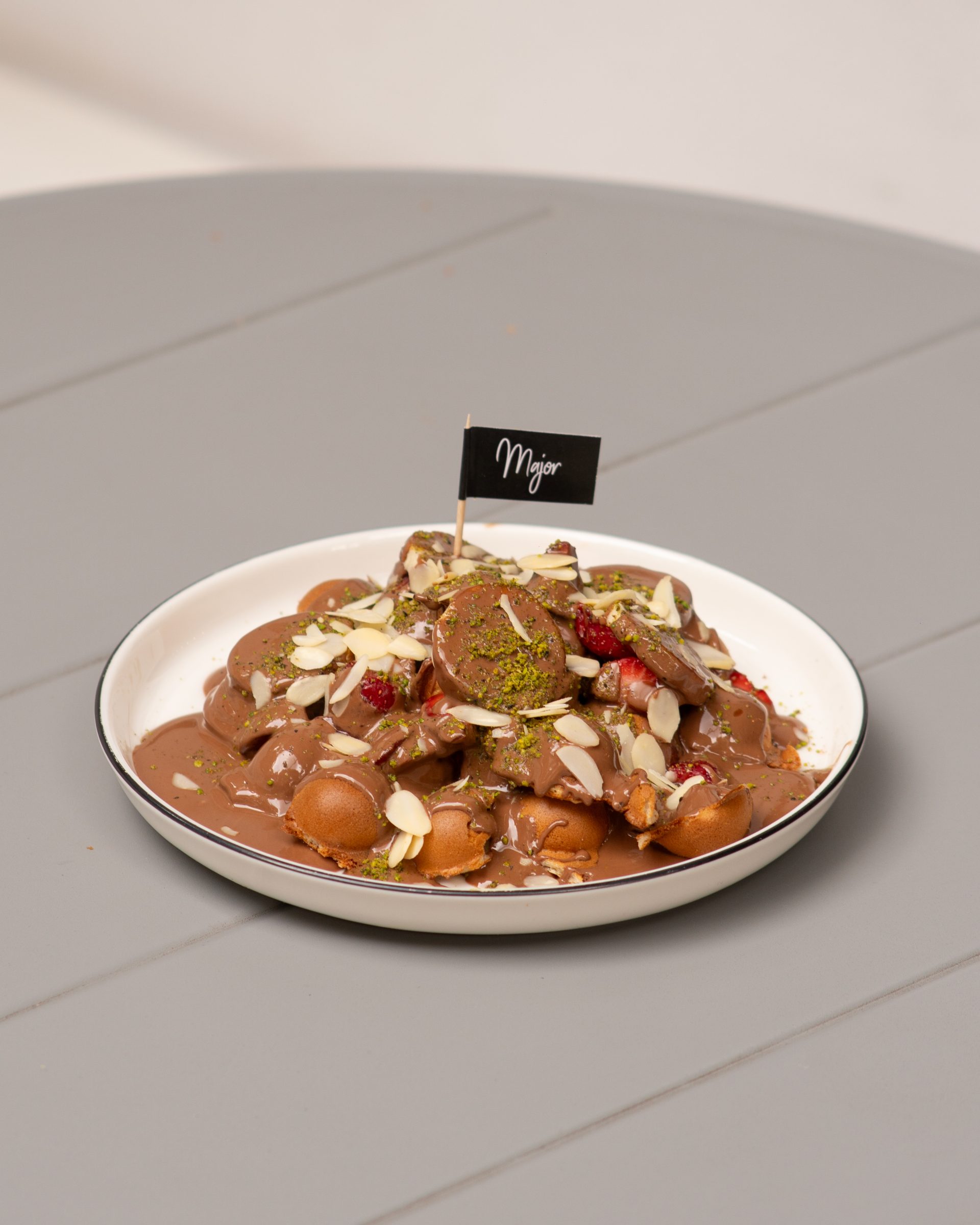 Sütlü çikolata ve mevsim meyveleri ile servis edilir.