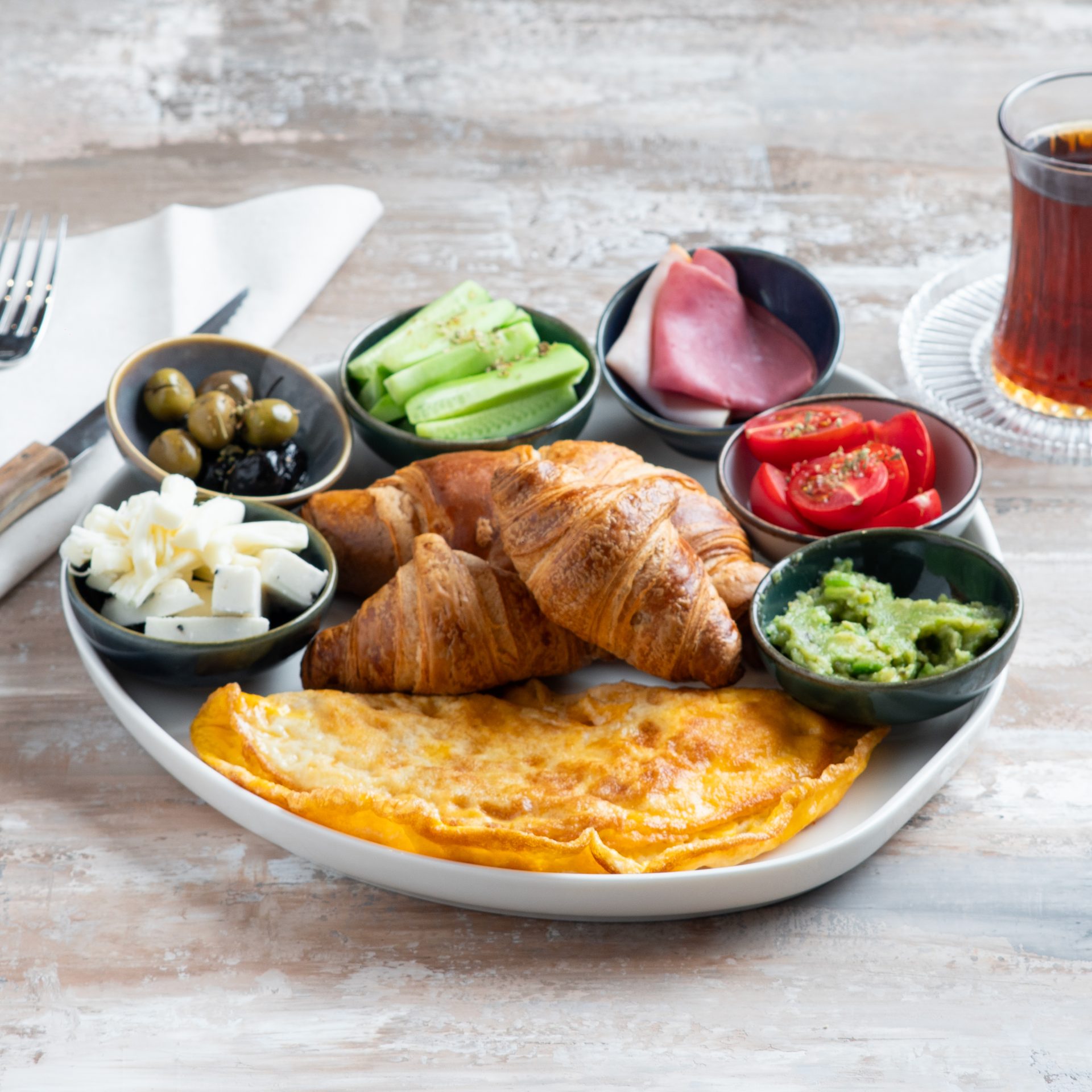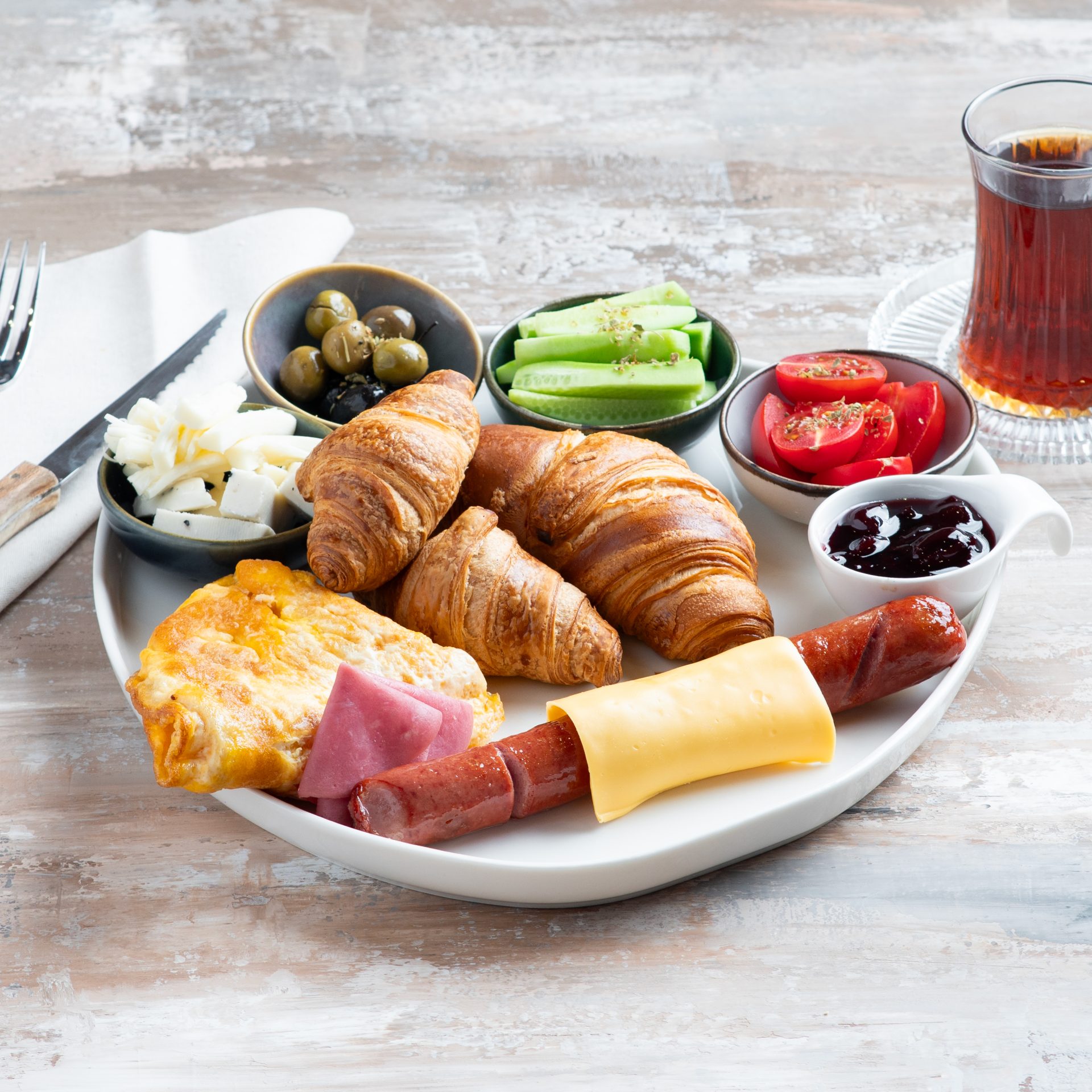 Mantarlı omlet, Haşlanmış yumurta, Izgara zeytin, Siyah zeytin, Yeşil zeytin, Salatalık, domates, dana jambon , Hindi füme, Hindi salam, Sürülebilir çikolata, Bal, Vişne reçeli, Ayva reçeli, Çeçil peynir, Çörek otlu peynir, Beyaz peynir, Kaşar peynir, Dilim avokado, Acuka sos, Közlenmiş biber ve patlıcan, Badem, kayısı, Ceviz, mini ekmek, simit, mini kruvasan, roll kruvasan, frakfurter sosis ve sınırsız çay ile