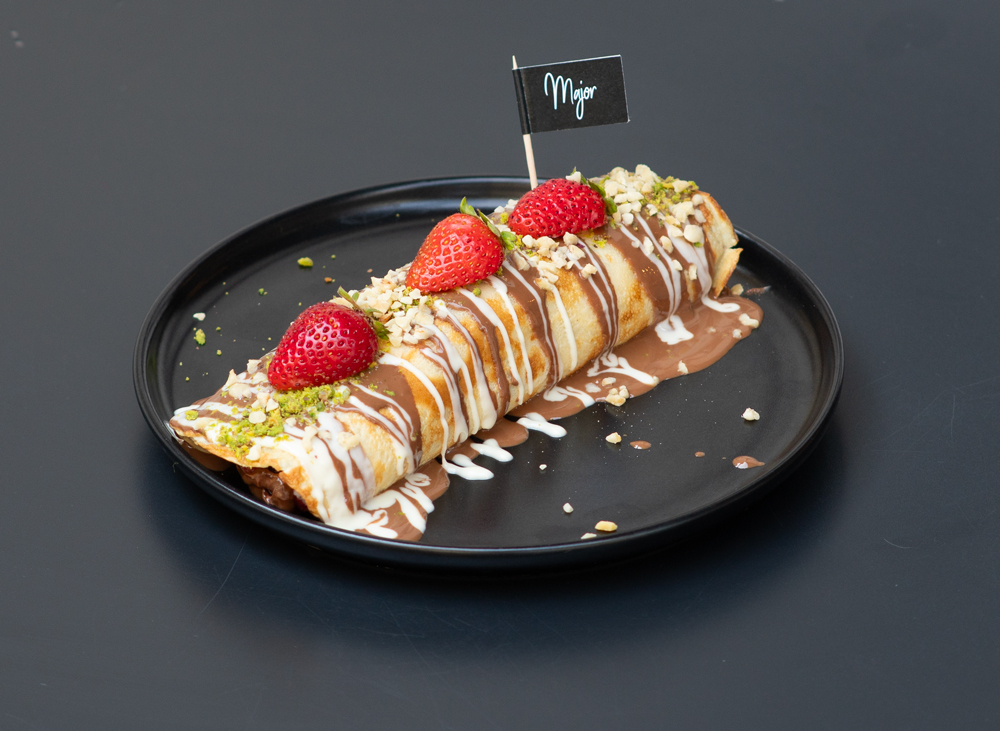 KREP HAMURU,İPEKSİ KREMA ,MEVSİM MEYVELERİ VE ÇİLKOLATA SOS İLE.